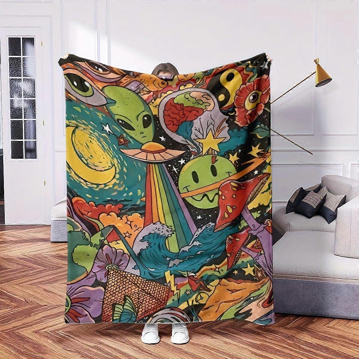 1pc Vibrant UFO & Space-Themed Flannel Blanket \u2013 Soft, Cozy Throw with Colorful Digital Print \u2013 Perfect for Of-PLKJD69