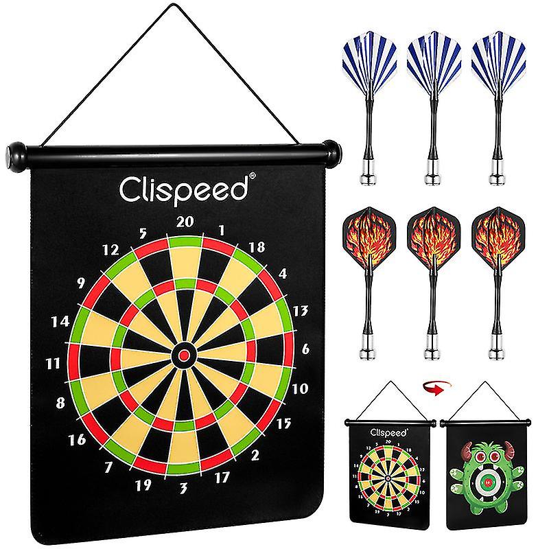 Feature - Color: As shown. - Material: Magnet and Cloth. - Size: About 46.5 x 37.5 cm. - Dual Sided. Classic dart board on one side, theme dart game on the other. - Strong magnetic darts without needle parts, which are much safer than traditional darts with points. The dart board has a built-in reinforced magnetic metal plate that firmly attracts magnetic darts. - Spiral seam technology, the dart board has a longer service life. dart board for convenient storage. - Great for leisure activities, exercising eyesight and child's reaction, relaxing your eyes, keeping hand-eye coordination. - Exquisite packaging, easy to carry, convenient to send as a gift.