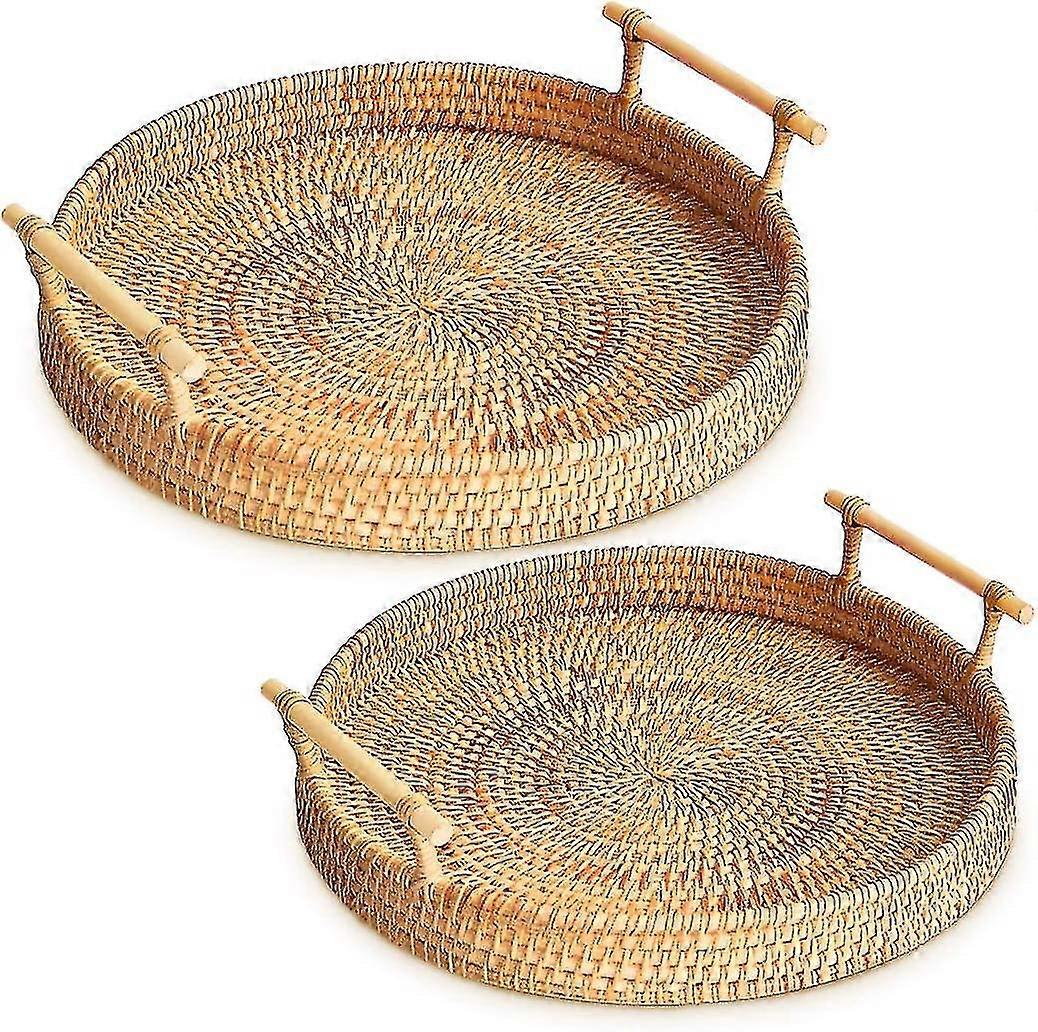 2 Size Hand-woven Rattan Tray Serving Tray With Handles, Wicker Tray Basket Tray For Bread Fruit Food Coffee Breakfast Display