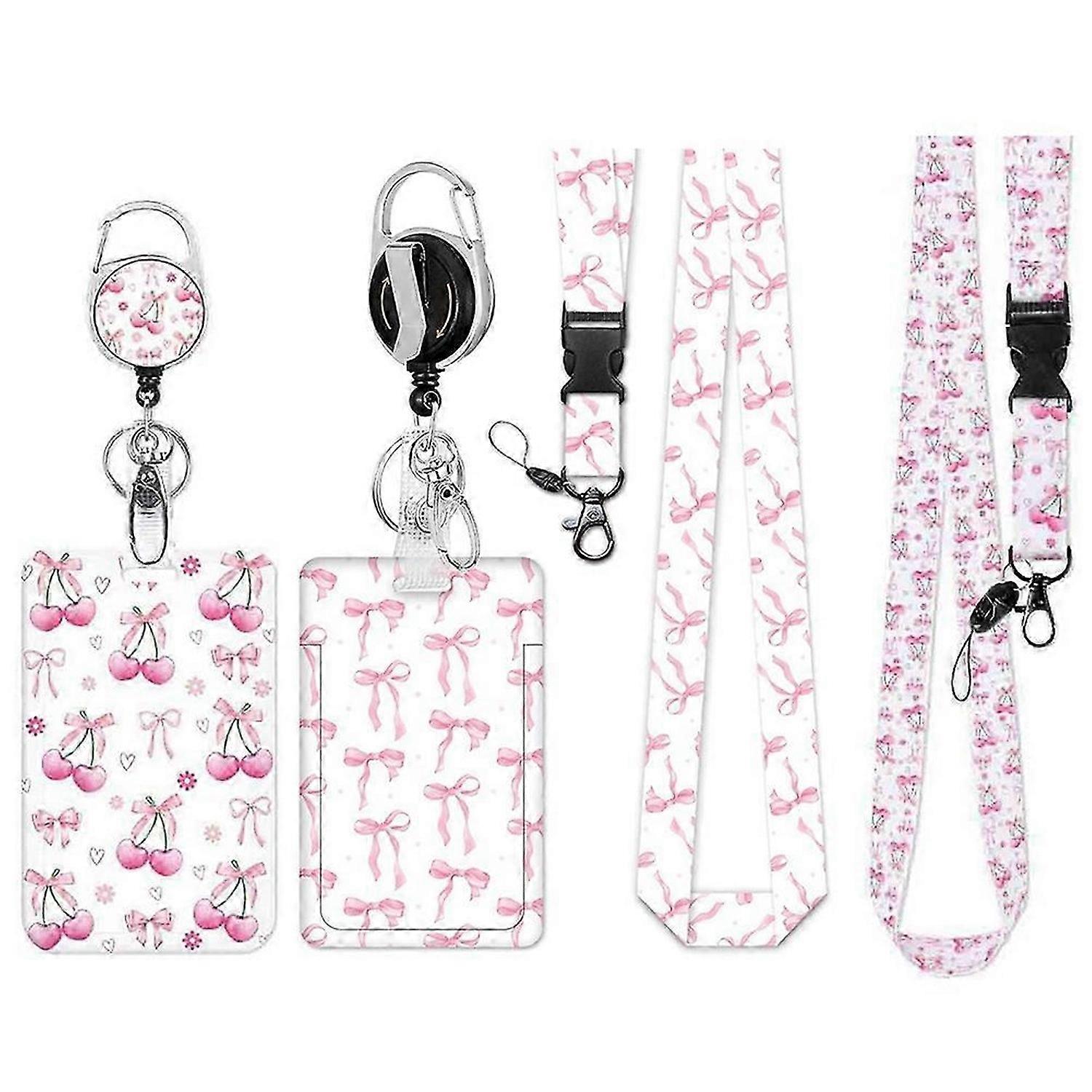 2Pack Badge Holder Retractable Clip with Lanyard,Pink Bow Cherry Print Lanyard with ID Holder for ID