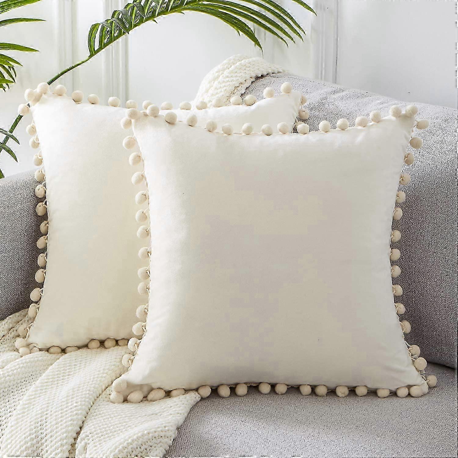 2 Pack Velvet Cover Pom Pom Cushion Cover Large Square Decorative Solid Color Design Throw Pillow Covers 20x20 Inches For Sofa Bed Living Room With Co