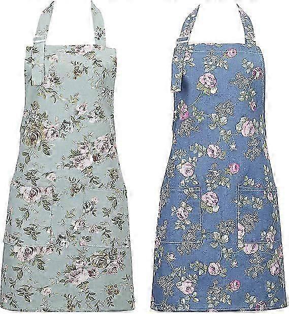 2 Pack Kitchen Aprons for Women, Adjustable Floral Aprons Chef Bakers Apron with Big Pockets for Cooking Baking Gardening