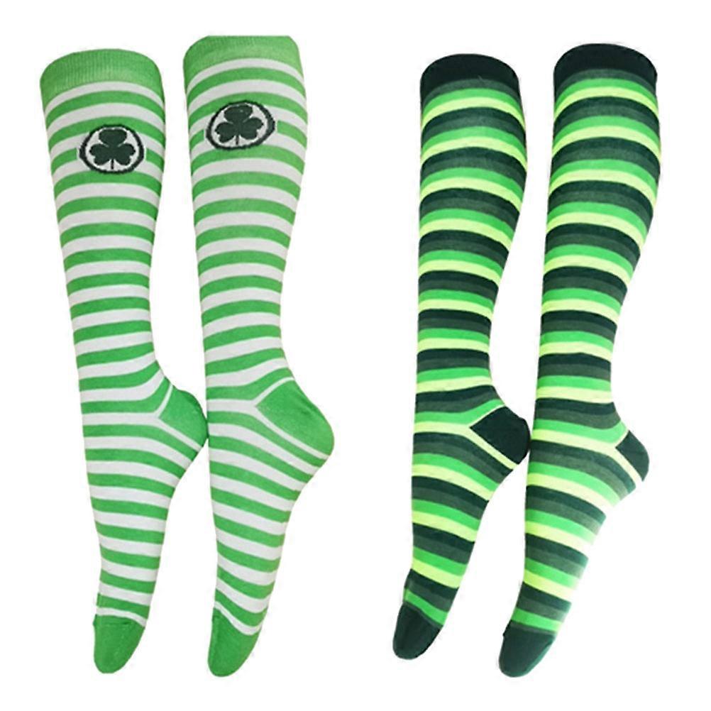 2 Pairs Warm Cotton Crew Socks for Women Lightweight Soft Fit Above Ankle with Clover & Stripe Patterns for Festive Saint Patrick's Day Comfort