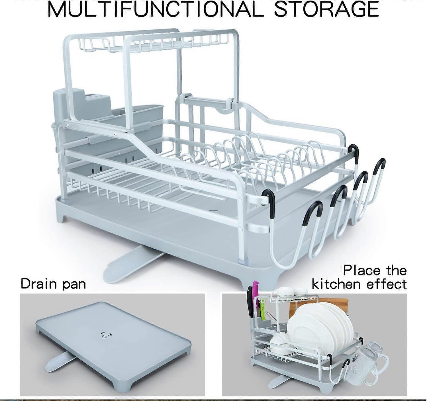 2 Tier Aluminum Dish Drainer with Drip Tray, Cup Holder, 3 Compartment Utensil Rack (Silver)