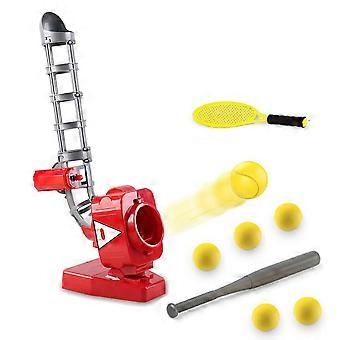 Feature:1. 2-IN-1 Pitching Machine - Works for Baseball and Tennis. Package included: 1 * Baseball pitching machine+1 * Baseball bat+1 * Tennis racket+6 * EVA ball+1 * User guide. Batteries not included.2. Protection Design and Automatic Mode - This upgraded version of the tennis baseball pitcher adds protection design, when the hand is accidentally placed into the pitch, the pitcher will not launch the ball. Switch the device to ON for pitching, press the red button to trigger pitching. Specification:Material: ABS, EVAColor: redSize: serve machine: about 28*62cm; baseball bat length: about 60.5cm, tennis racket length: about 40.3cm, ball diameter: about 6.5cmPower supply: 4*LR20 1.5V battery (not included)Uses: outdoor tennis, baseball, parent-child interactive gamesWarning: Children may get injured and/or have accidents when playing sports. Supervision recommended when using this toy. This 2-in-1 pitching machine set is designed with kids' safety in mind and is safe when used correctly.Package List:1 * Baseball pitching machine1 * Baseball bat1 * Tennis racket6 * EVA ball1 * User guideNote:Do not place your hands or foreign objects in the pitch. The ball is thrown every 5S-7S in automatic mode.Over Load Protection - Self-regulating jam protection built into the device. If unresponsive or jammed, turn off the machine, remove balls and wait 5-10 minutes before turning the machine back on. The device will reset and work properly.Height adjustment: Four different angle gear adjustments fit children of different heights, and the body is easy to disassemble and install. Retractable bat, using high-strength PVC, used in real time, easy to carry. 6 EVA balls, safe and environmentally friendly, super light, even if hit the body will not cause pain and injury.Give the Perfect Sports Gift - Constant repetition is the most important step to becoming an expert! Automated pitching machine makes repetition and batting practice easy.