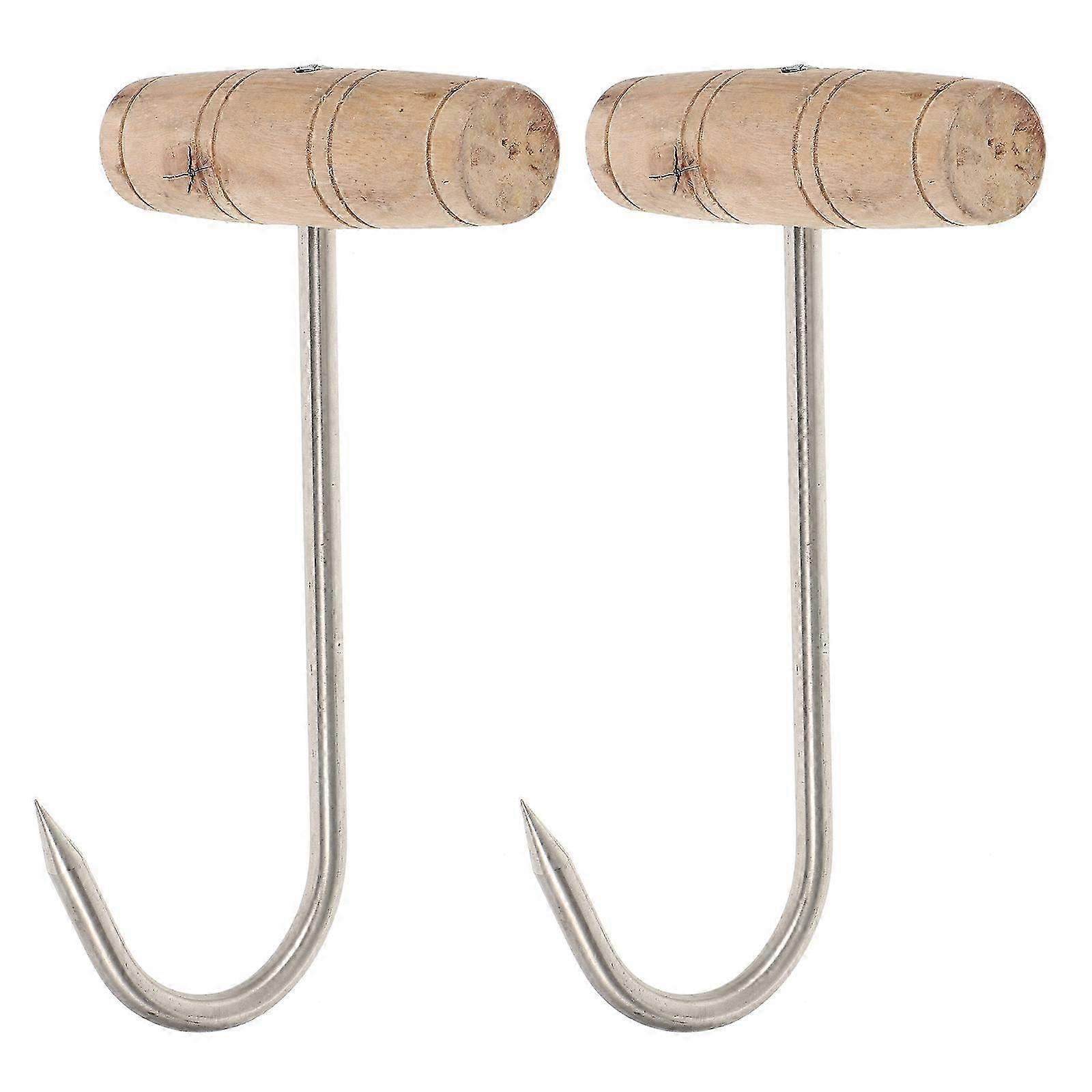 2pcs Stainless Steel Meat Hook Wood Handle T Shaped Hanging Hook Bacon Meat Hook