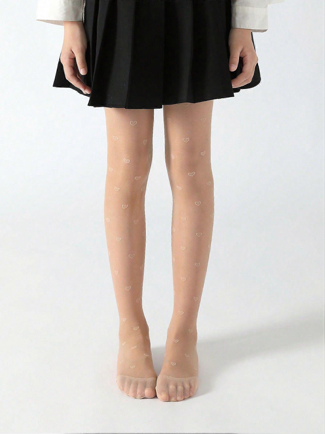 2pcs Girl Kids Black Solid Heart Jacquard Thin High Elasticity Stirrup Fishnet Stockings, Tights, Pantyhose, Suitable For Dance, Daily Wear, Preppy St
