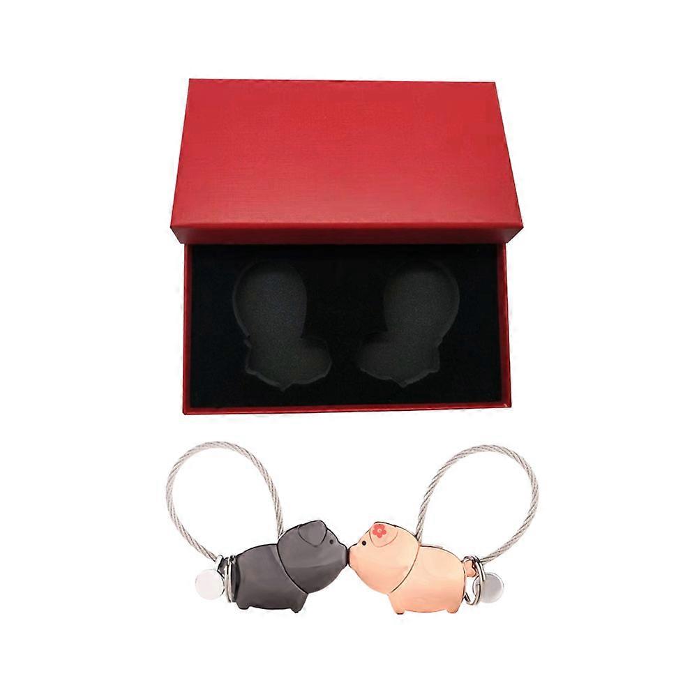 2Pcs Magnetic Lovely Piggy Designed Car Keychain Couple Keyrings Keyring Pendant with Gift Box (Black, Rose Gold)