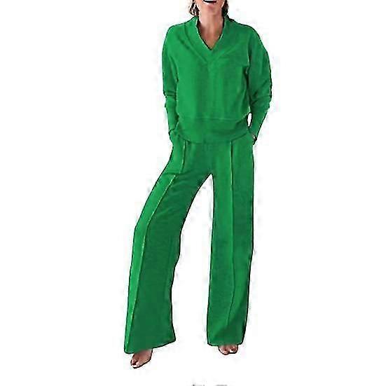 2 Pcs Women's V-Neck Sweatshirt & Wide Leg Pants Set Solid Color Sport Outfit