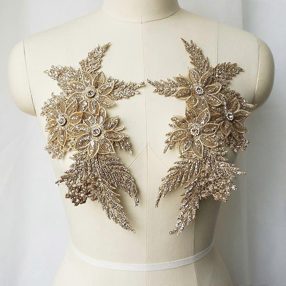 2Pcs Rhinestones Gold Sequin Embroidered Lace Applique Sewing Flower Fabric Patch Wedding Gown Bridal Dress Clothes DIY Crafts