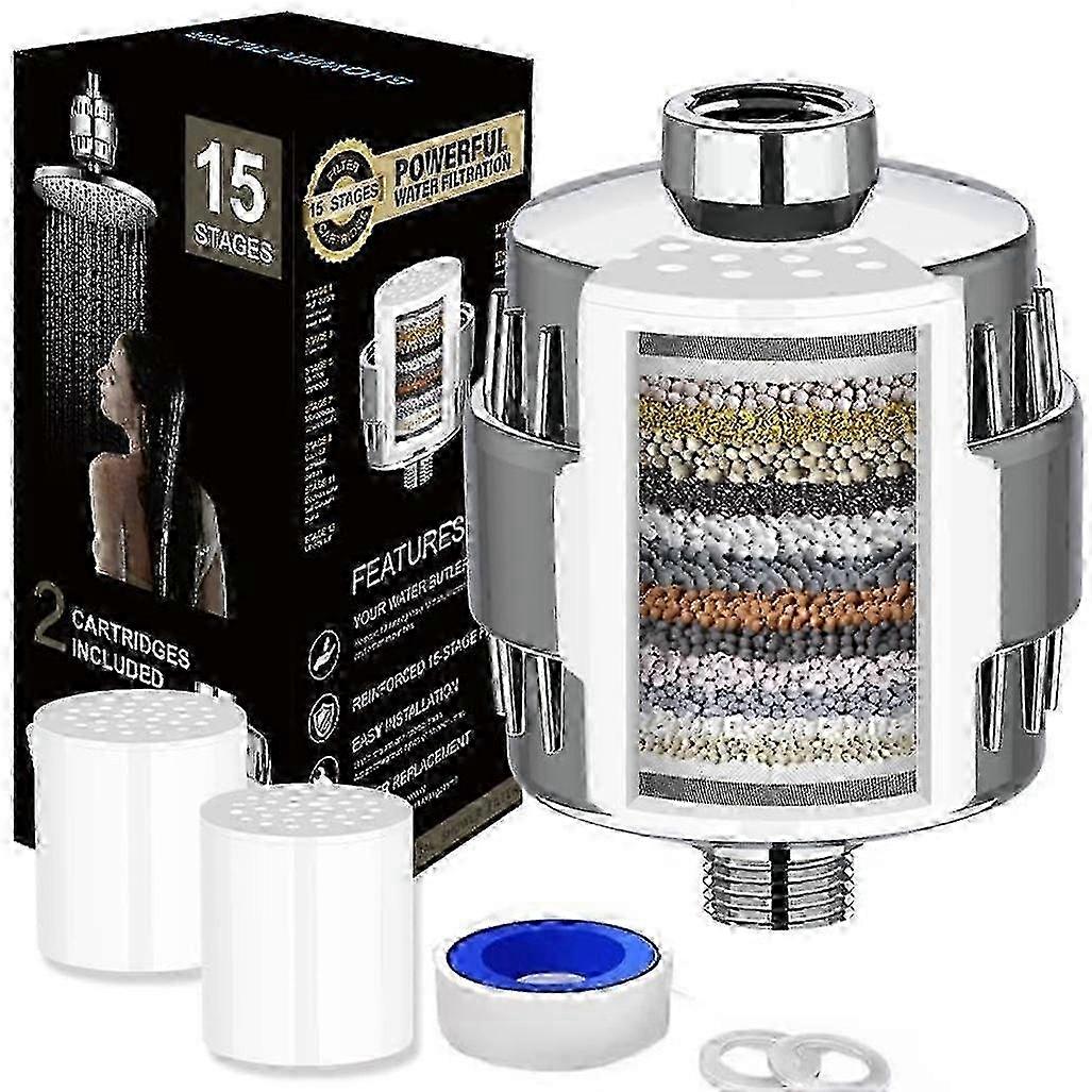 [15-Stage Filtration]The Shower Filter comes with a 15-stage filtration system, which uses a variety of filtering materials such as Alkaline Ceramic Beads, Activated Carbon, Calcium Sulfite and other filtering materials, ensuring the purification of water quality. 15-Stage filter materials can effectively reduce chlorine, heavy metals, rust, sand and other sediment. .[Essential Products for Body Care]High-output shower filter removes unpleasant odors and dirt, quickly relieves fatigue, smoothes your skin. This shower filter acts as a water softener, humidifier, purifier, softens and provides the feeling for sensitive skin. .[2 Replacement Cartridges]A total of 2 filter cartridges are included. The capacity of each cartridge is 12,000 gallons of water, which provides clean and odorless water, and can be used by a family of four for 6-8 months. .[Essential Products for Body Care]High output shower filter removes unpleasant odors and impurities, quickly relieves fatigue, smoothes your skin. This shower filter water softener acts as a humidifier, purifier, softens and provides the feeling for sensitive skin. .[Wide Compatibility and Easy to Install]The shower filter for hard water is designed with a standard "1/2" thread type that fits most homes. It can be easily installed on rain shower heads, fixed shower heads and hand showers according to the instructions without any tools. Note: Due to the light and screen setting difference, the item's color may be slightly different from the pictures. Please allow slight dimension difference due to different manual measurement.