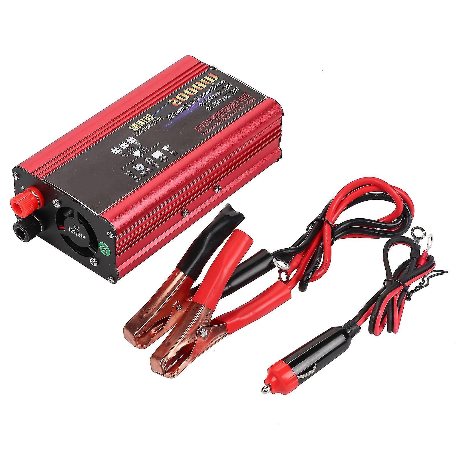 1High converting efficiency. It converts a voltage of DC 12V/24V into AC 220V. 2Steady and precise output voltage. 3Advanced chip technology, high conversion efficiency. 4Overload and overheat protection, overheat protection. Voltage converter to the world standard. 5Can be operated with your car cigarette socket or direct connected with wires clips.Features: High converting efficiency. It converts a voltage of DC 12V/24V into AC 220V.Steady and precise output voltage. Provide 2000W of AC power. Advanced chip technology, high conversion efficiency.Overload and overheat protection, overheat protection. Voltage converter to the world standard. Intelligent cooling fan system, CPU microprocessor to realize multiple protection.Can be operated with your car cigarette socket or direct connected with wires clips. Adapting aluminum alloy case, antioxidant, sturdy and durable.Specification: Material: Metal + Plastic Color: Red + Black Continuous Power:1000W Maximum. Power:2000W Input Voltage: DC 12V DC 24V Output Voltage: 220V-240V Frequency: 50+/-3Hz USB Output: DC 5V Output Wave Form: Modified Sine Wave Package Weight: approx. 988g/34.9oz Package list: 1 * Power Inverter 1 * Car Charger Plug 2 * Clamp with Cable