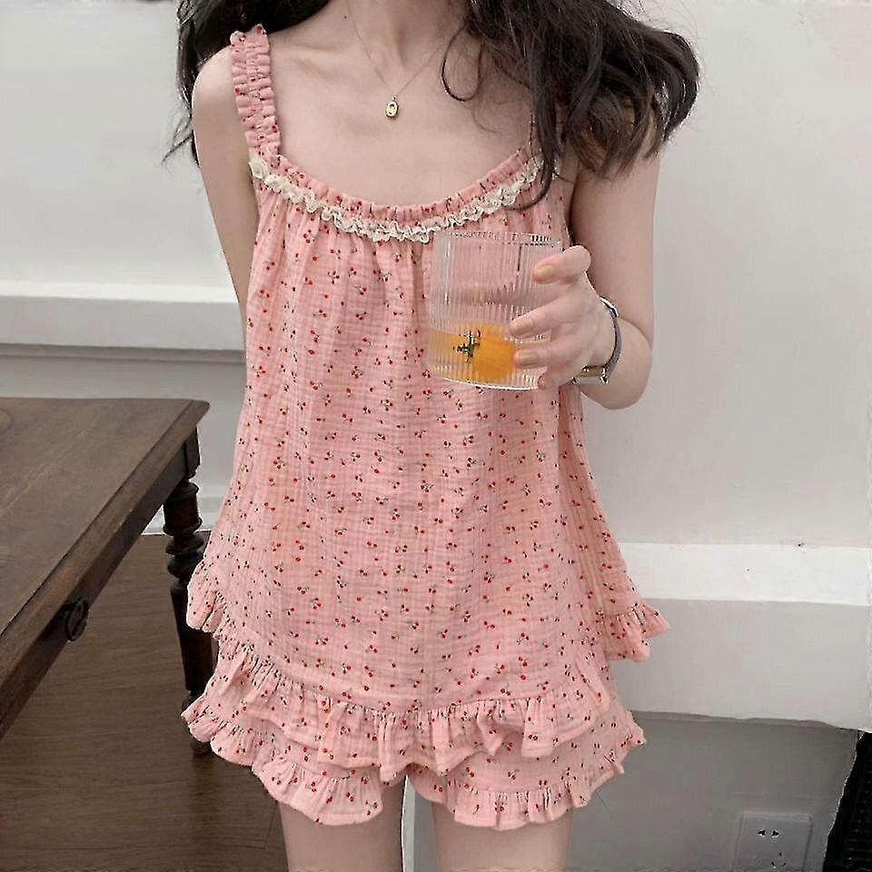 2023 New Women's Spaghetti Straps Pajamas Set Cherry Print Shorts Ruffle Sweet Girl Candy-colored Pajamas Comfortable And Casual
