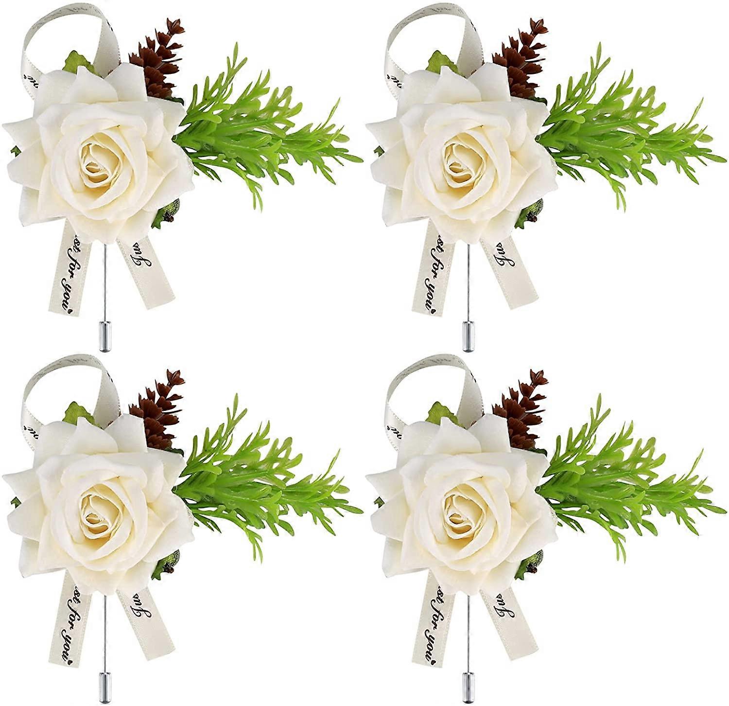 2023 - 4 Pcs Wedding Boutonnieres, White Rose Corsage Buttonhole Flowers with Pin Clip
