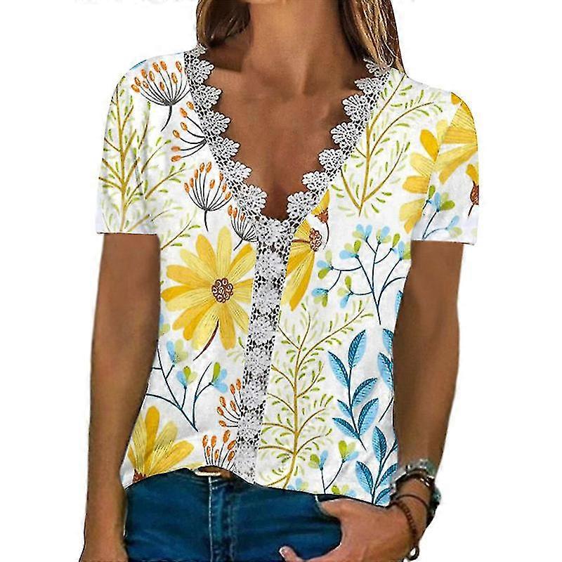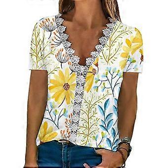 2024 New Short-sleeved Comfortable Casual Lace V-neck Printed T-shirt For Women/YY