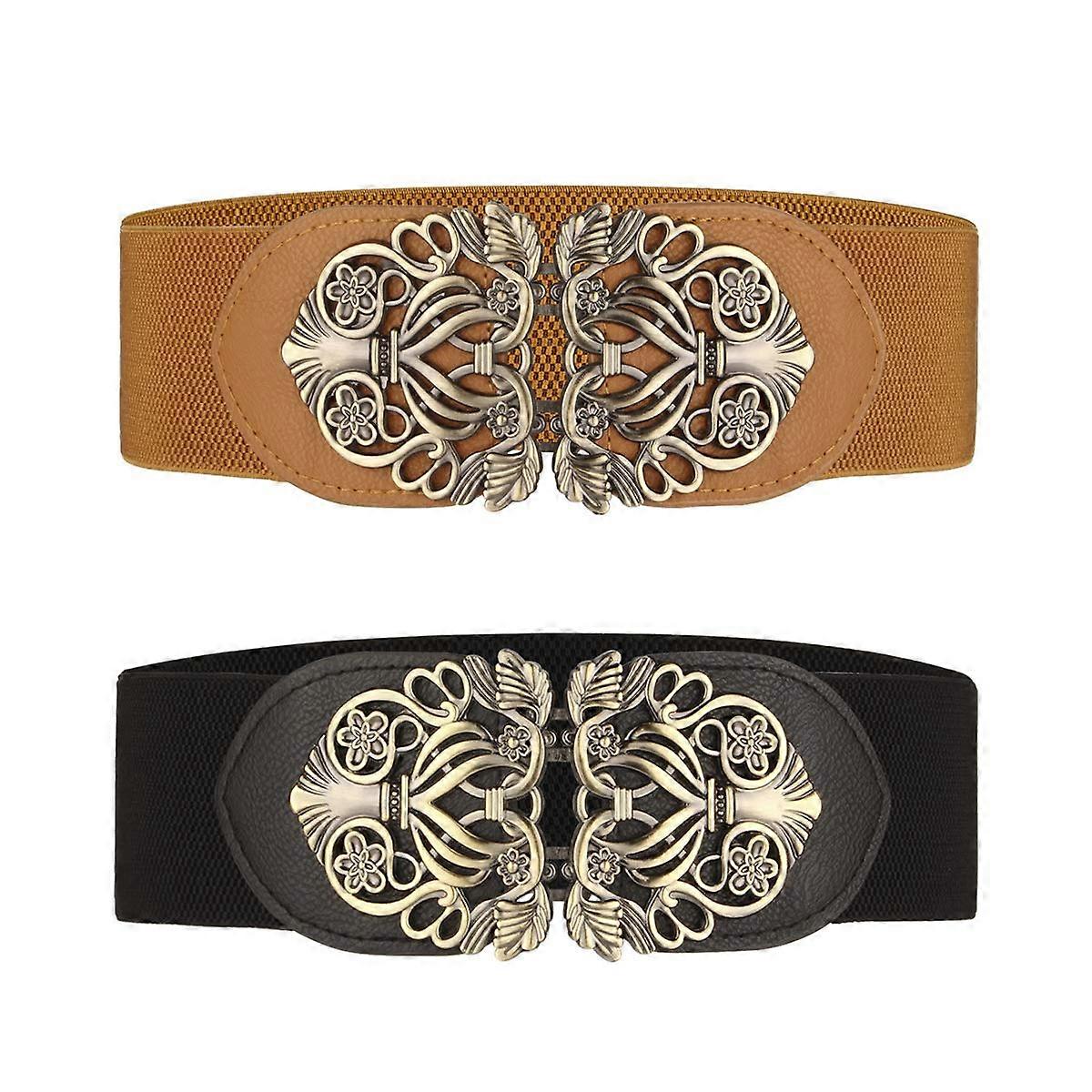 2025,Womens Wide Elastic Waist Belt 2Pcs Retro Ladies Stretch Waist Dress Belt,Black & Brown