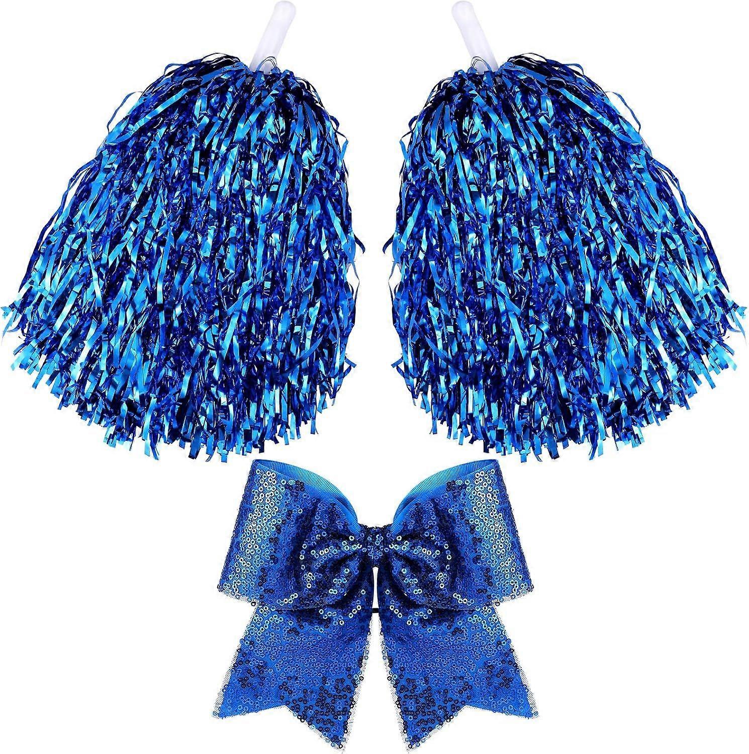 Lightweight and Portable Cheerleading Pom Poms: the cord length of each cheerleading pom pom is approximately 10 inches, the handle measures about 3.15 x 0.67 inches, and weighs only 40 grams; This feature ensures the pom poms are lightweight, easy to handle, and portable, making them a companion for any cheerleading event or practiceComplete Cheerleading Set: this set includes 2 cheerleading pom poms and 1 matching large cheerleading hair accessories; They are brightly colored and sequined, suitable to match any cheerleading outfit; Having a complete set adds convenience and ensures uniformity, resulting in a cohesive cheerleading lookMultiple Uses for Different Occasions: these cheerleading pom poms and cheerleading bows can be adapted for different occasions, events, parades, and scenarios, such as cheerleading competitions, school spirit rallies, sporting events, or paired with school uniformsSafe and Sturdy Materials: cheerleading pompoms are made of reliable PE plastic material, and large cheerleading hair accessories are made of fabric, ensuring safety and sturdy Our cheerleading accessories are designed to be sturdy and safe, giving you peace of mind when using them for a long timeMaterial and Size: these hair bows are carefully made of ribbon and sequins, which are comfortable and stylish; They are 7.5 inches long and 7 inches wide, suitable for most ages, and are suitable hair accessories for ponytails for women