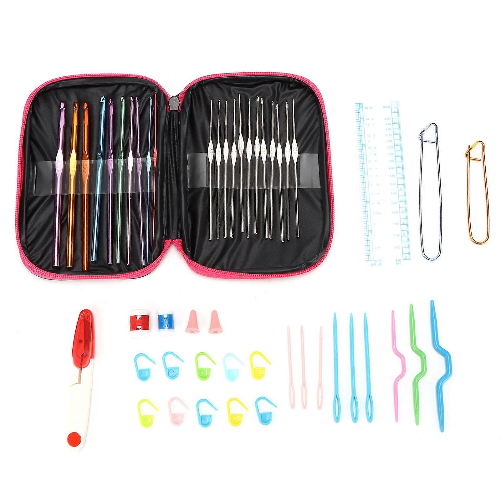 22pcs Crochet Hooks Ergonomic Design Knitting Needles Colored Alumina Hook With Accessory Toolsrose Red Faux Leather Case122b/ck003