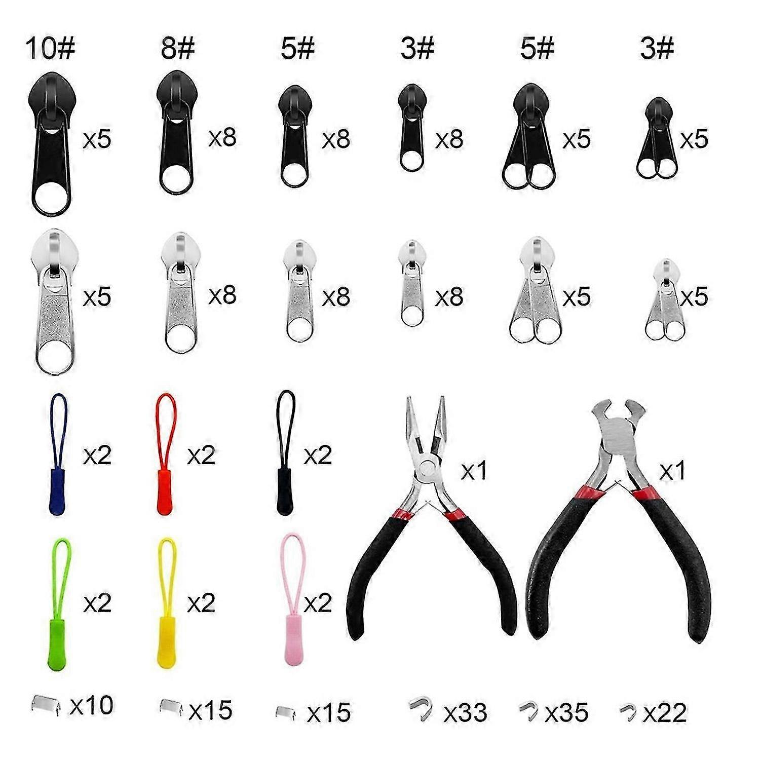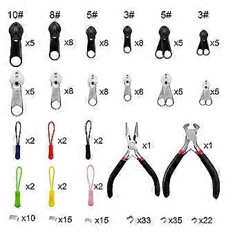 The zipper replacement kit includes zippers, zipper pull replacement, zipper top stop and zipper bottom stop and installation tools for repairing or replacing zippers on bags, tents, suitcases, sleeping bags, jackets, meeting your diverse needs. In the zipper repair kit, there are 3 sizes of zipper and zipper fixer (zipper top stop and zipper bottom stop), which can match repair objects of different sizes. The zipper repair kit can meet your different sewing needs. All zipper sliders in the universal zipper repair kit are made of metal, which is sturdy and . The of the zipper repair kit is smooth and flat without burrs, which helps to repair zippers and extend the service life of items. The zipper repair kit comes with a classifiable plastic box, and all accessories are neatly packed in a portable plastic box, which is easy to store and find for use. is small and can also be carried out. The zipper replacement kit is simple and practical, and is very suitable for giving sewing enthusiasts as a sweet gift on birthdays, Mother's Day, Easter, Christmas and any other festivals.<br><br>Colour:As Shown Material:Metal<br><br>Package Contents: 1set * zipper repair kit<br><br>Only the above package content, other products are not included. Note: Light reflection and different displays may cause the color of the item in the picture a little different from the real thing. The measurement allowed error is +/- 1-3cm.
