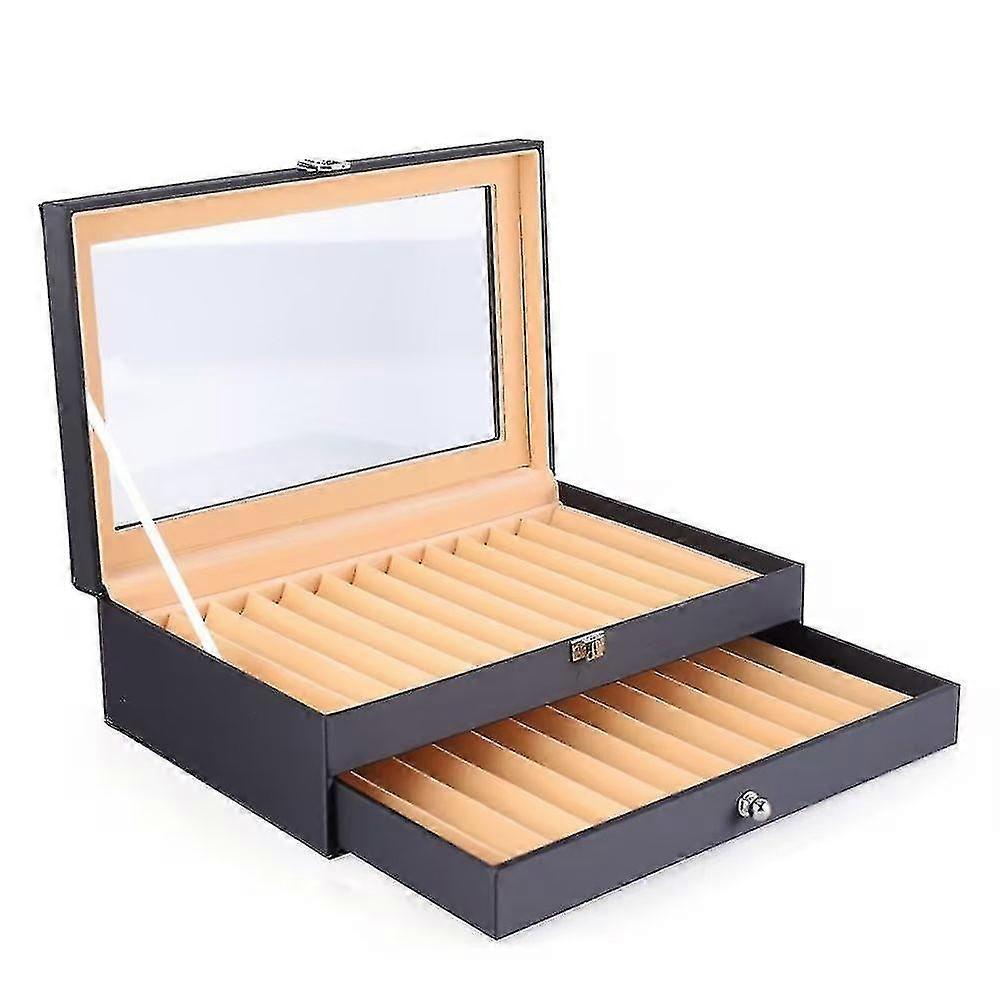 We present a finely designed pen display box with adequate storage for 24 exquisite designed pens for the passionate pen collector. This leather pen display box may be used to show, store, and preserve your vast collection of pens. The pen display box looks neat and professional on a desk, dresser, or nightstand. Or it could be a nice present for your best friends Key Features: Large Capacity: It can protect, preserve, and organize up to 24 of your best pens. Each compartment is large and has curved grooves that securely hold pens of different kinds and sizes. Ideal Present: The pen display box can be used as a gift for any occasion. It is a wonderful present for your husband, wife, mother, father, friend, or pen collector. Luxury Style: The attractive leather pen display box protects and provides a luxury feel to pens while enabling you to keep and display your favorite pens in one handy and appealing location. Highly Protective: Its curved slots keep each pen fixed and protect pens from scratching and rubbing. High-quality Material: The pen display box is made of PU and flannel, which makes it resistant to deformation, corrosion, and fading, as well as being fashionable and long-lasting. Exquisite Construction: The 2-layer case with a handy drawer is used for maximum space efficiency. The skylight design allows for easy access and a spectacular presentation. Easy Storage: This pen display box can organize almost all your pens. You no longer have to find the pen you need in a cluttered pile of pens. Easy to Clean: All you have to do is wipe it with a clean towel, and it'll be as good as new. Details: Transparent Lid: It has a clear transparent glass top lid that allows for easy observation of the pens and also keeps them dust-free. High-grade Hardware: Its latches and drawer handles are made of high-grade hardware materials, which are bright, resistant to rust and fading. Tight Thread: Tightly stitched threads make this pen display box more beautiful and sturdy. High-quality Flannel: This pen display box is lined with premium flannel. It's non-slip and anti-corrosion, which can protect your pen in a better way. Multi-Compartments: This pen display box has 2 layers and 24 slots to keep your pens in order. It also has a beautiful and practical design. Application: The pen display box looks neat and professional on a desk, dresser, or nightstand. Or it could be a nice present for your best friends Specification: Colors: Black Outer Box Material: PU Leather Lining Material: Flannel Number of Grids: 24 Net Weight: 1.2kg/2.6lbs Gross Weight: 1.5kg/3.3lbs Product Size: 30.5x 20x 9.5/12"x 7.9"x 3.74" Package Size: 31x 20x 10cm/12.2"x 7.9"x 3.9" Package Included: 1 x Pen Display Box Notes: 1. Please note that the pen is not included. 2. Please allow the slight color difference caused by the shooting light and 1-3 cm error due to manual measurement, and make sure you do not mind before ordering.