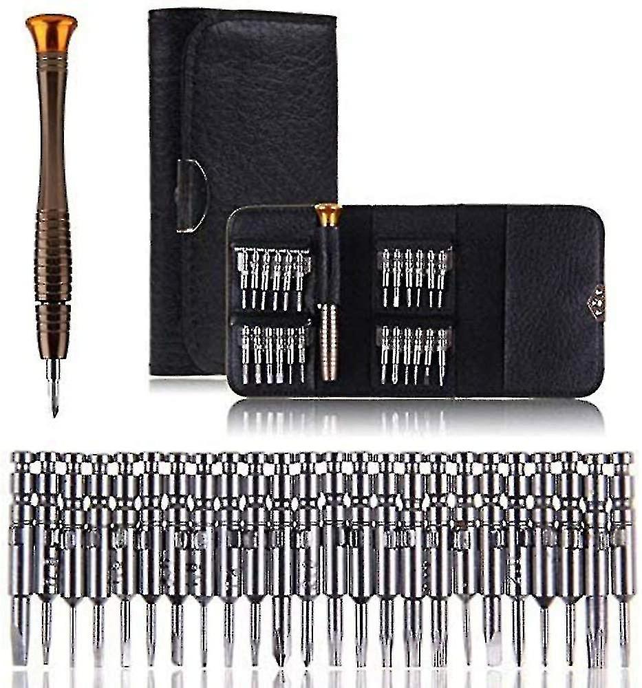 Product Description Package content: 1X 25 in 1 screwdriver combination 1.Package included - 24 screwdriver heads + 1 handle + 1 leather case. 24 bits: 10 Torque; 5 cruciform; 4 split heads; 2 stars; 1 triangle; 1 tri-wing; 1 round. 2.High Quality - The precision screwdriver head is made of stainless steel (chrome vanadium steel) with special heat treatment. Leather storage bag, lightweight and portable, internal bayonet head set, not easy to knock over. 3.Easy to Use - Just twist the nib and check the screwdriver. Thanks to the grooves, the handles with non-slip surface hold hands particularly well and help you, and even sit on screws. 4.Widely Used - Available for most digital products, various kinds of computers, mobile phones, cameras, glasses, jewelry, watches, laptops, etc., and is very suitable for modeling, DIY.