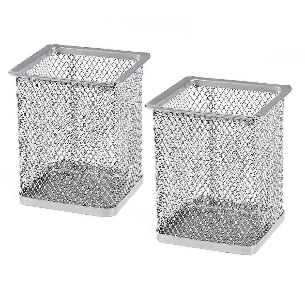 2pcs Metal Pen Pot Square Mesh Pencil Holder Container Organizer (silver)