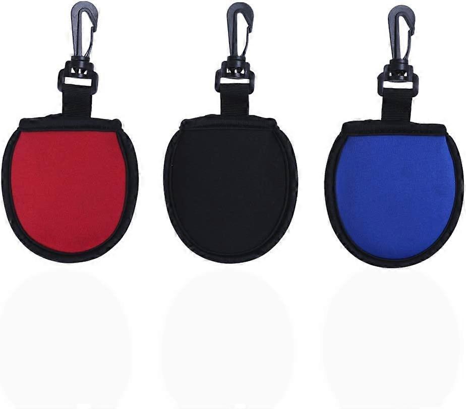 Combining different outer and liner materials keeps the inside wet and the outside dry for ease of use.Product size: about 170*95mm. This ball cleaner is small and lightweight and fits easily into your pocket.Comes with a plastic clip for carrying, hanging on a golf bag or clipping to a belt loopSimply turn the bag inside out, wash and dry to clean after usePackage Included: 3pcs Black, Blue and Red Golf Pocket Washer Bags.