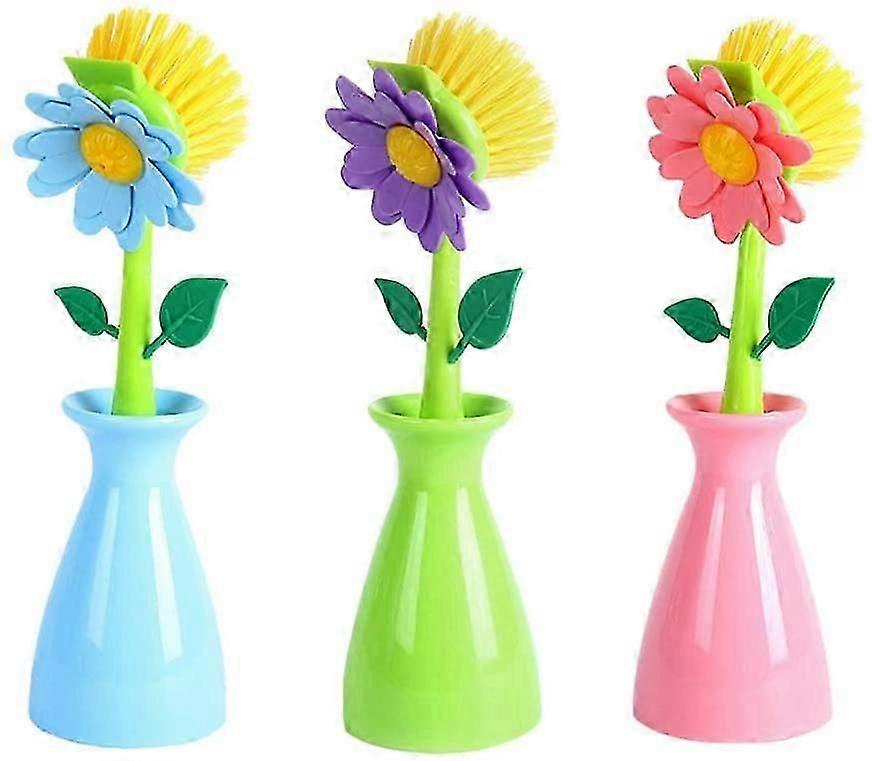 3pcs Kitchen Scrubber Brush Cute Flower Shape Long Handle Dish Scrubber Clean for Scrubbing Kit