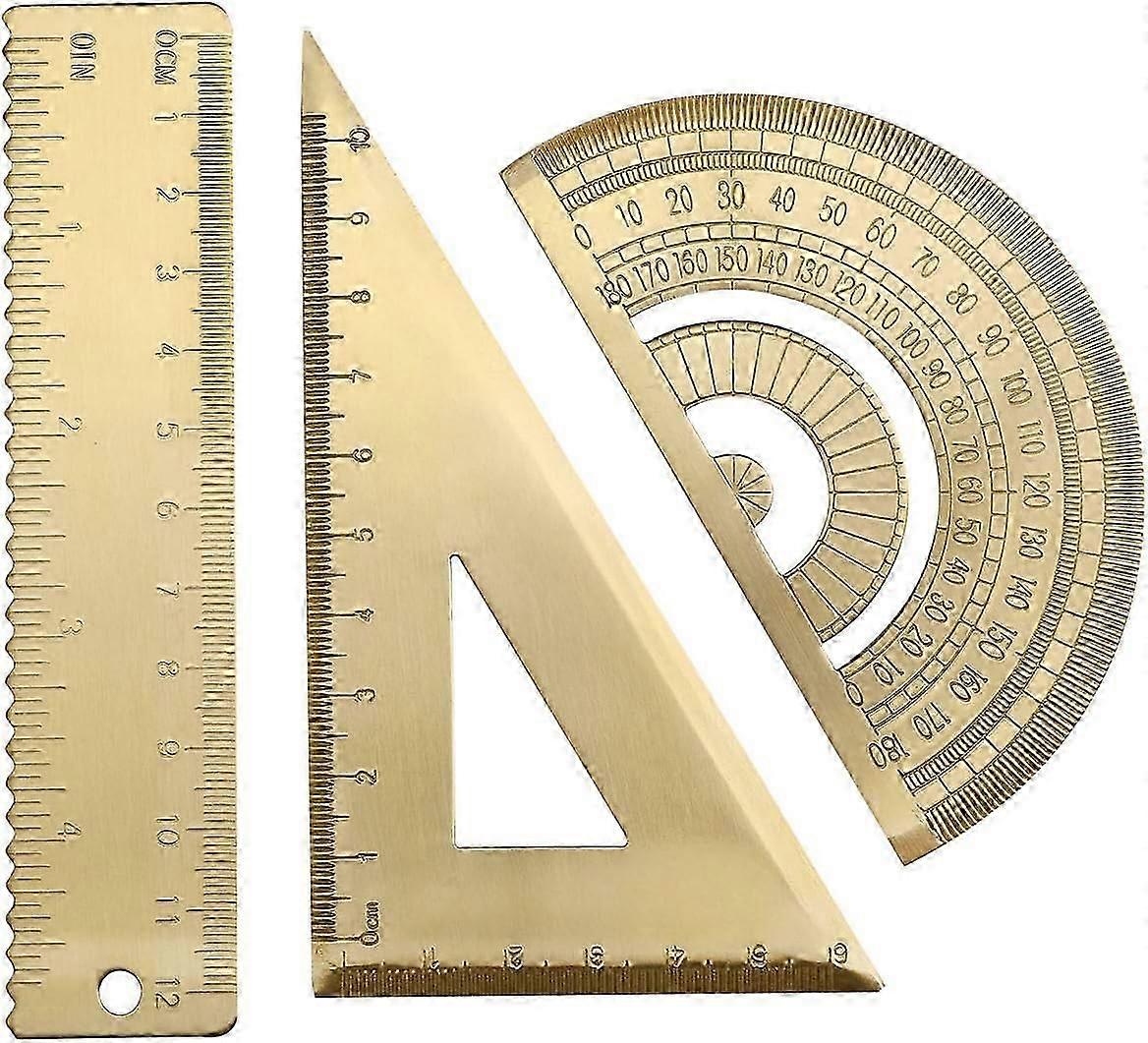 3Pcs Brass Math Geometry Set Golden 12cm Ruler Protractor Triangle Ruler
