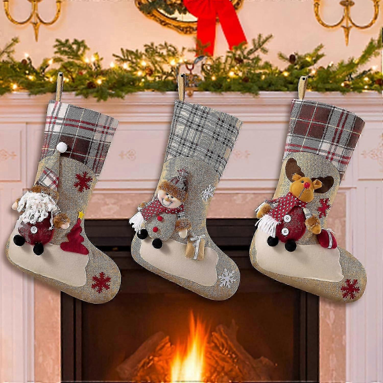 3pcs Christmas Stockings 18 Inches Large Size Burlap Christmas Stocking With 3d Santa, Snowman, Reindeer Pattern Gifts For Family Christmas Decoration