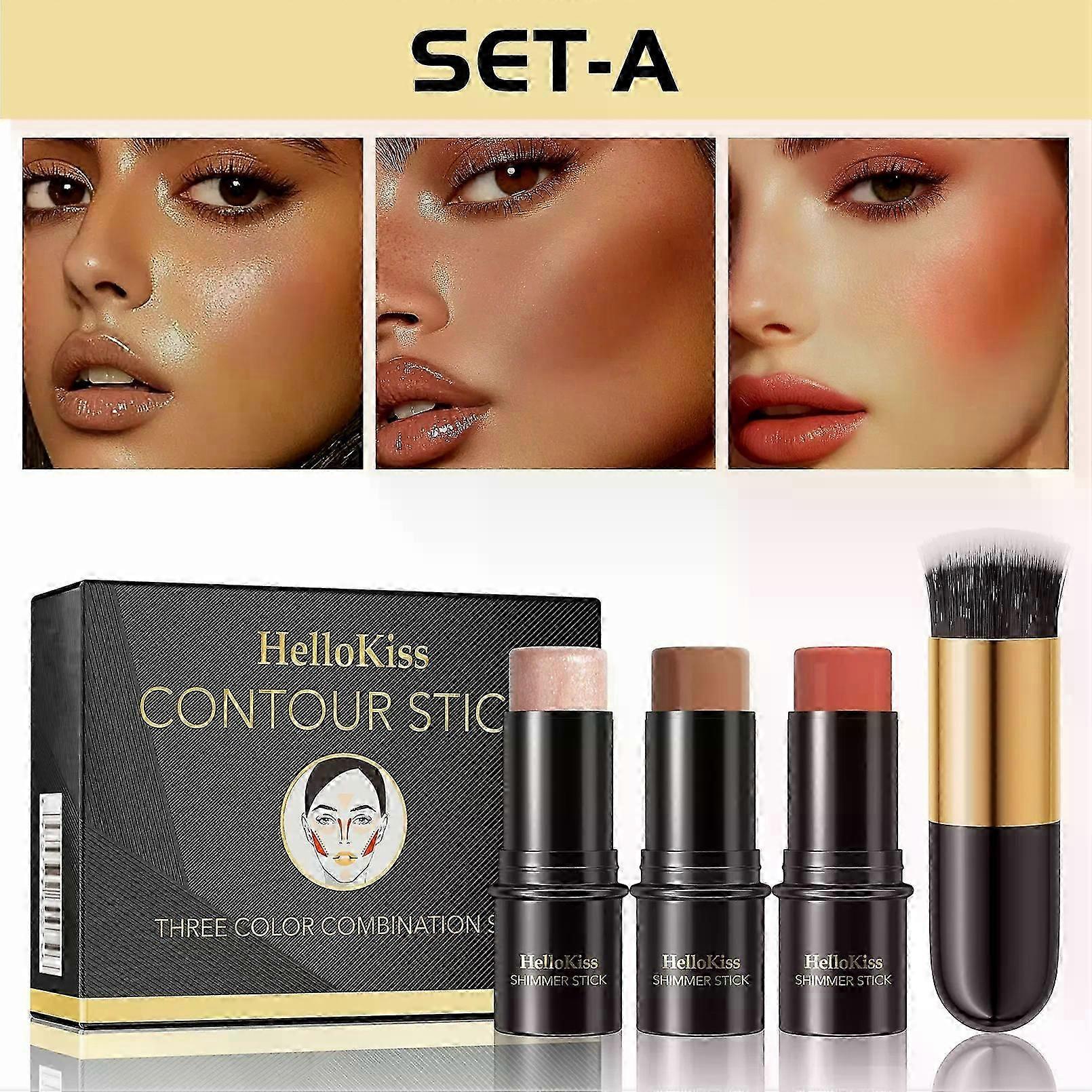 3Pcs Cream Contour Stick Makeup Kit, Shades with Highlighter, Blush and Bronzer Contour Stick for Cheeks, Lips, Eyes, Natural Face Contouring, Long La