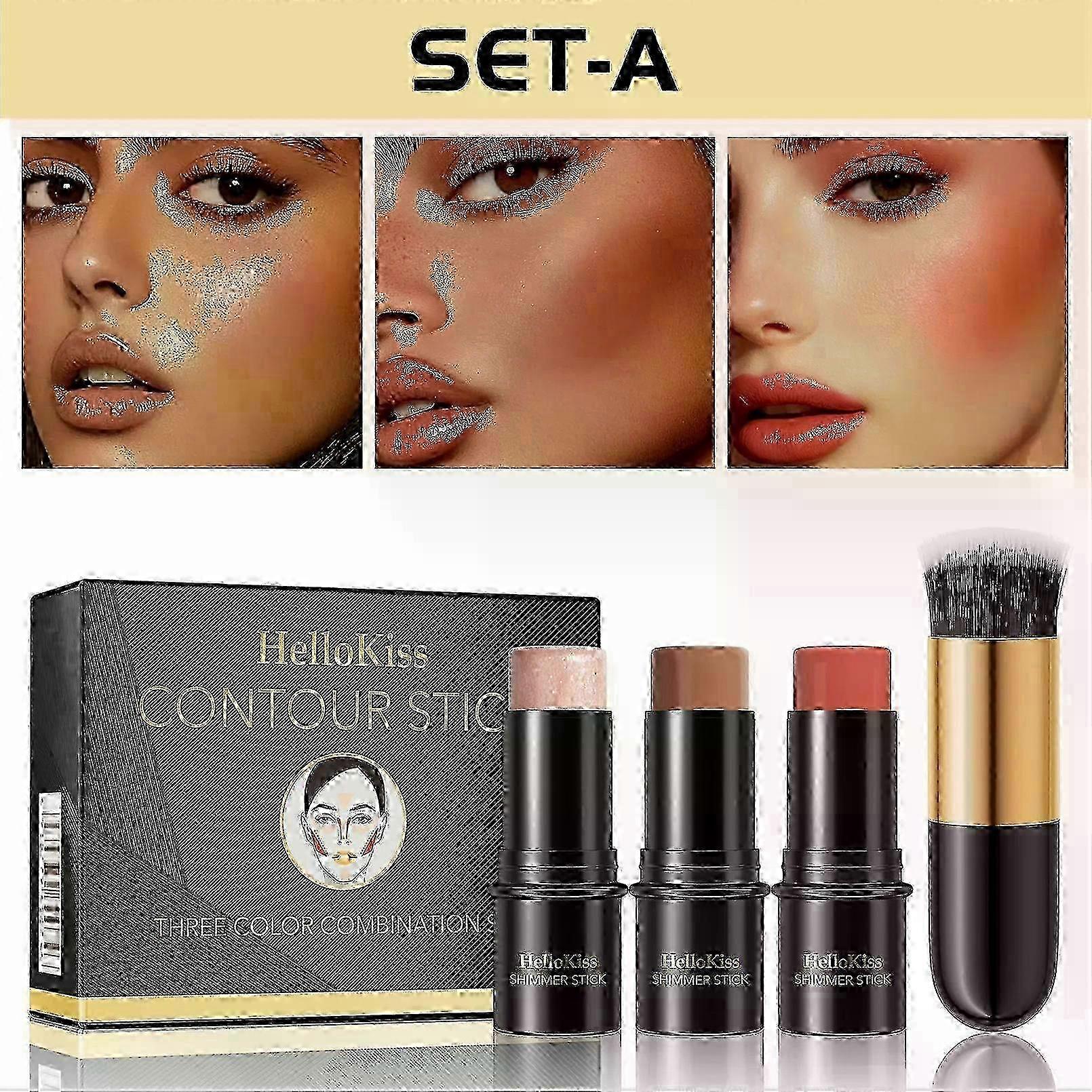 3Pcs Cream Contour Stick Makeup Kit, Shades with Highlighter, Blush and Bronzer Contour Stick for Cheeks, Lips, Eyes, Natural Face Contouring, Lo
