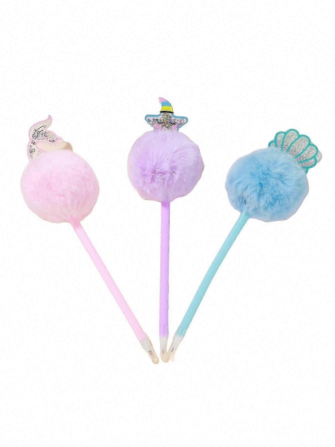 3pcs Cute Marine Theme Quicksand Pens - Mermaid, Starfish, Shell Shapes, Plush & Pompom Furball Pens