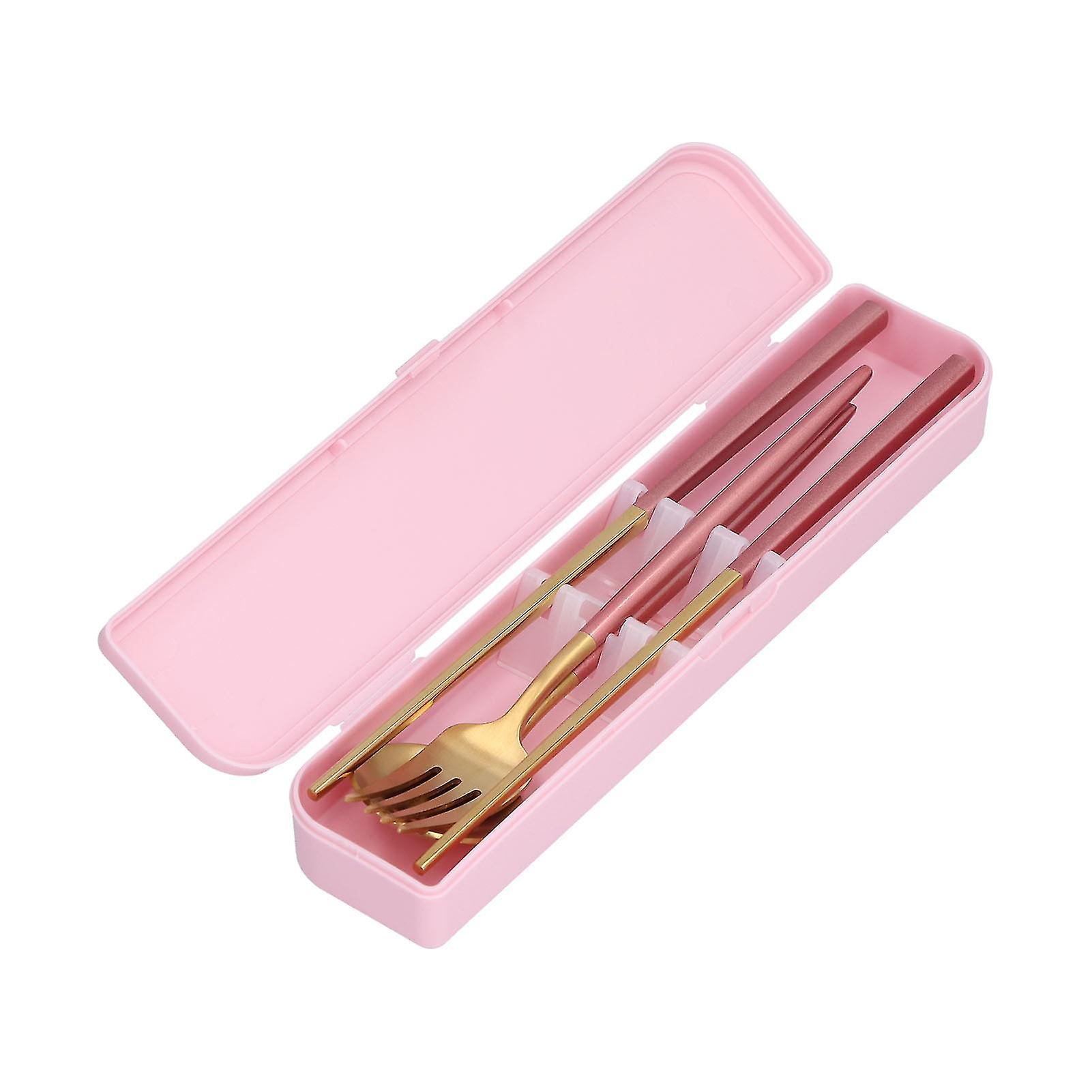 3Pcs/Set Portable Travel Utensils Stainless Steel Spoon Fork Chopsticks Set for SchoolPink Gold (Pink Storage Box)