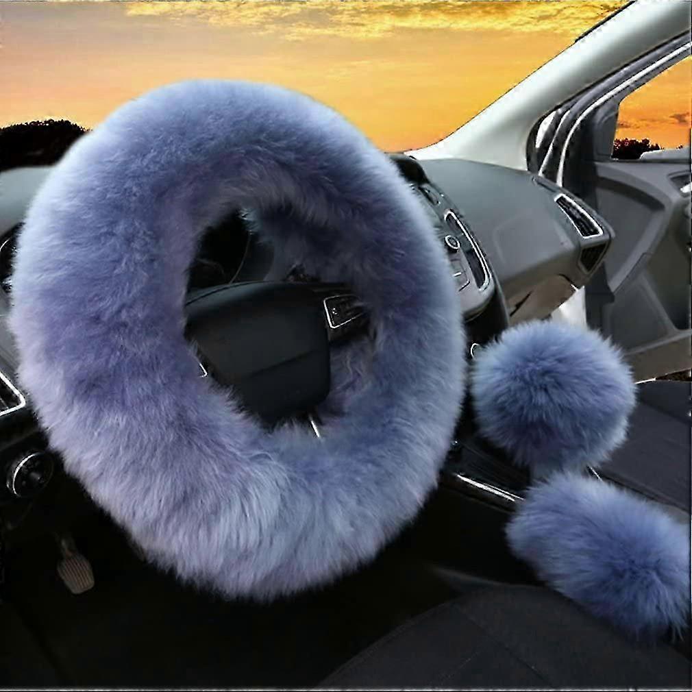 3Pcs Set Womens Winter Fashion Wool Fur Soft Furry Steering Wheel Covers Gray Blue Fluffy Handbrake Cover Gear Shift Cover Fuzz Warm Non-slip Car Deco