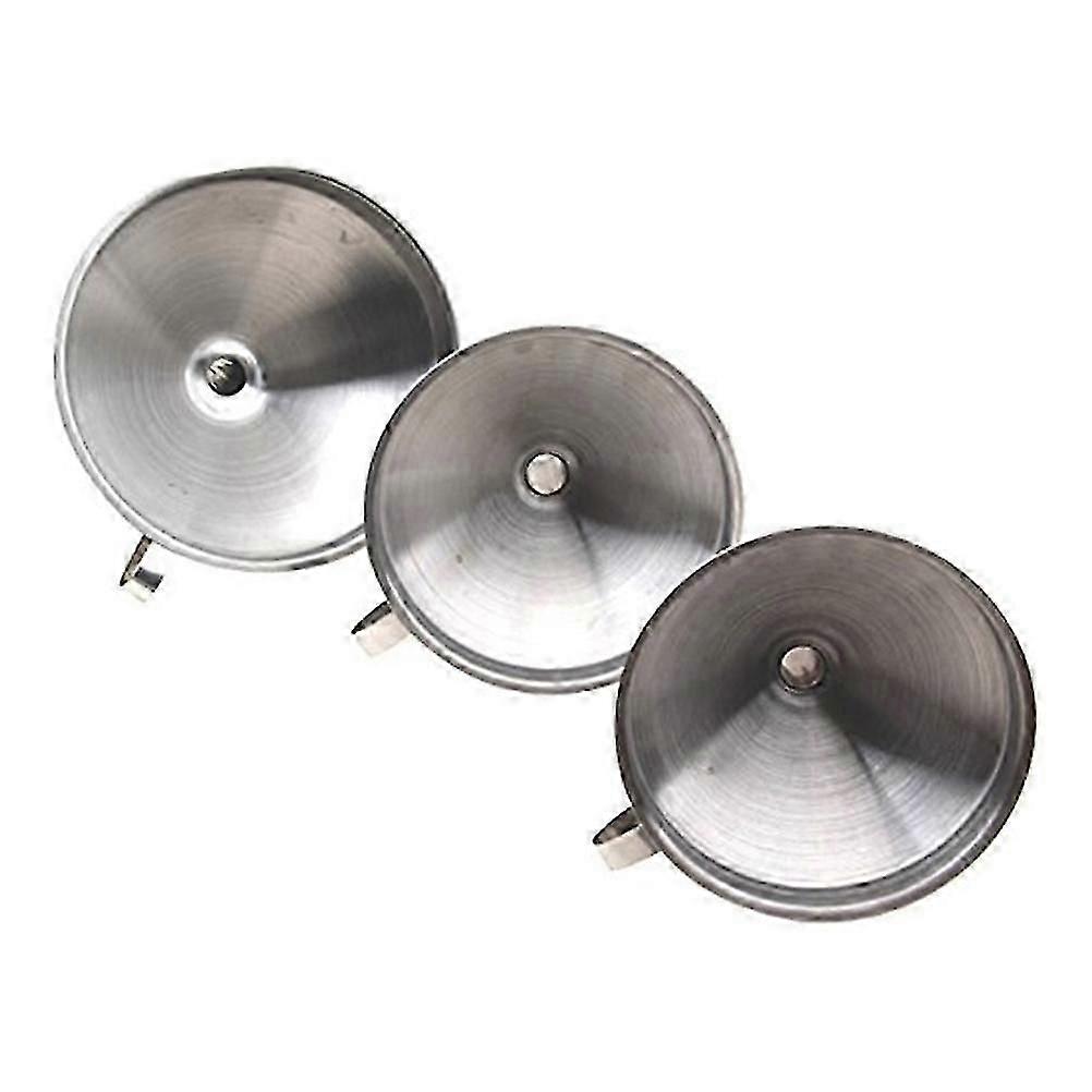 Description The Stainless Steel 3-Piece Funnel Set is a useful tool for transporting liquids, bottling, mixing, and adding fine ingredients into bottleneck vessels. The material used in its construction should be sturdy enough to withstand the weight of the substance being transferred, and it should not with the substance. For this reason, stainless steel is used. Features - Color: Shown in the pictures.- Material: Stainless steel.- Size: 4 inches/11 centimeter diameter and 10 centimeter of height. 5 inches/13 centimeter diameter and 11 centimeter of height. 6 inches/15 centimeter diameter and 11 centimeter of height.- for durable and long-lasting use.- Lightweight for portable carry.- Metal handle for convenient holding.- For multipurpose use in the kitchen or craft table.- Stores easily and resists wear and tear.- Easy to clean and dishwasher safe.Packing list: 3 Piece Funnel Set Stainless Steel kitchen Craft Table Funnel
