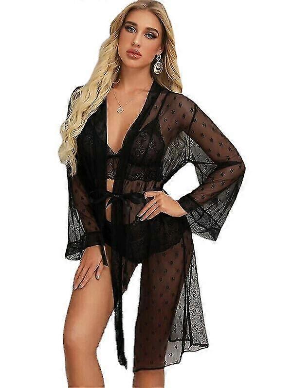 Women Sexy Lingerie Set 3 Piece Lace Kimono Robe With Bra And Panty Sheer Sleepwear