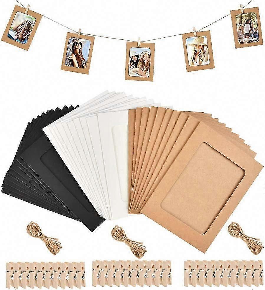 30 Pcs Kraft Paper Photo Frame for Wall Decoration, 3 Colors with 30 Wooden Clips and 3 Hemp Ropes