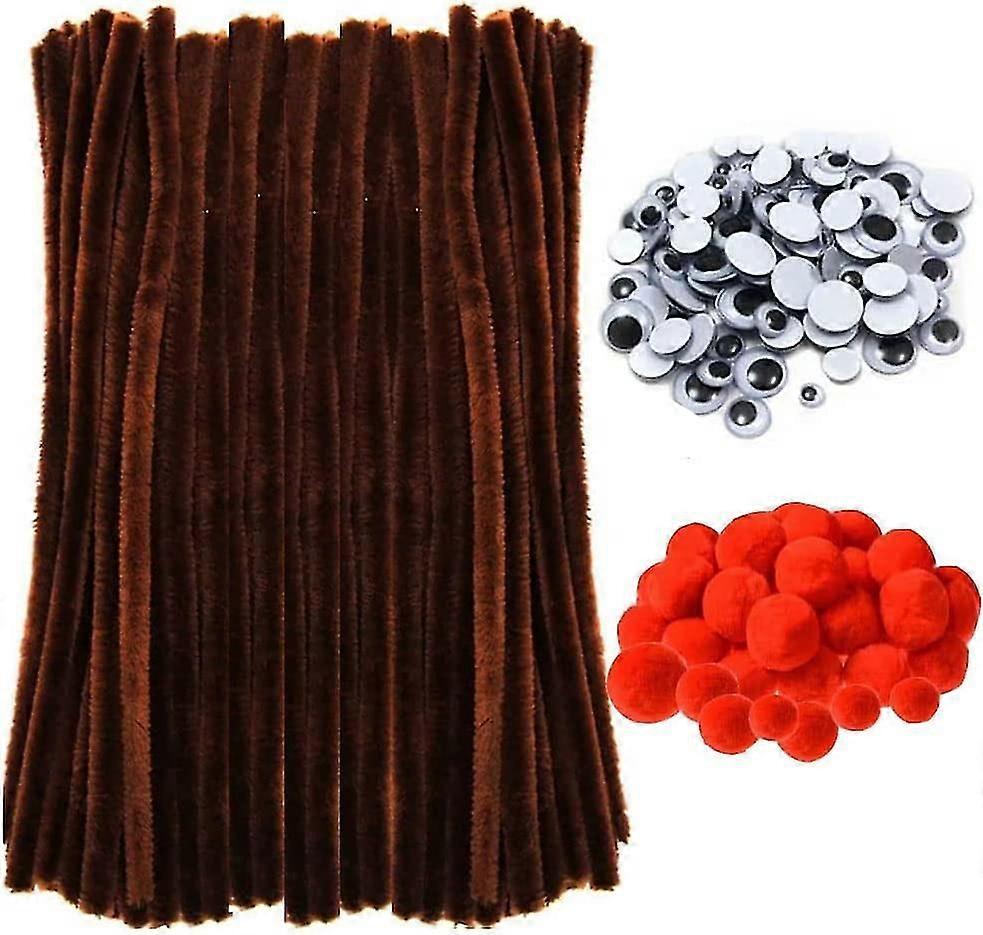 300pcs Christmas Brown Pipe Cleaners Set Including 100pcs Brown Chenille Stems, 100pcs Self-sticking Wiggle Googly Eyes And 100pcs Red Pompoms For Chr