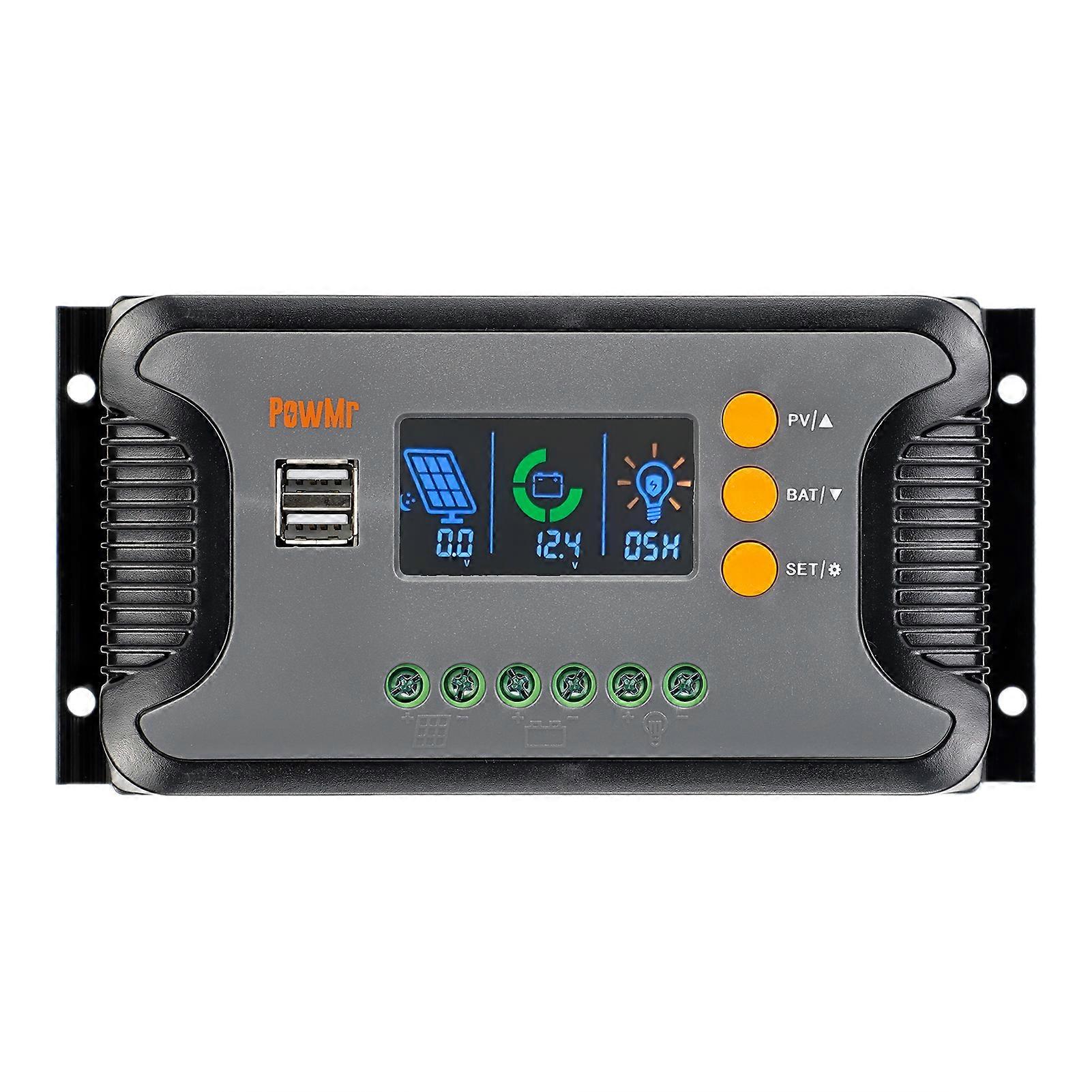 30A PWM Solar Charge Controller 12V-48V Lithium Battery Charging with Bulk Boost Float Modes LCD Display Dual 5V USB Output Auto Detection
