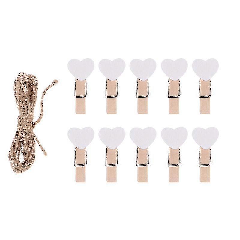 30pcs Wooden Heart Photo Paper Pegs Craft Clips Clothespins With Hemp Rope For Wedding Party Decor (white)