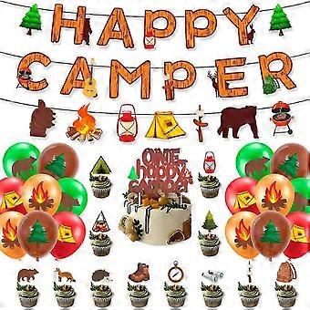 32PCS Camping Themed Party Decorations, Happy Camper Party Hanging Decorations, Happy Camper Banner Latex Balloon Cupcake Toppers