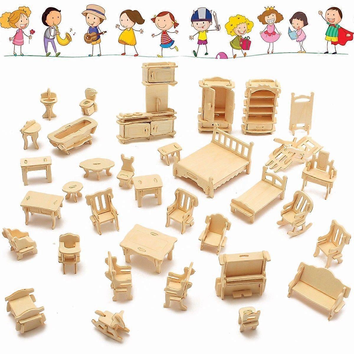 34 Pcs Miniature 1:12 Dollhouse Furniture For Dolls Mini 3D Wooden Puzzle DIY Building Model Toys For Children