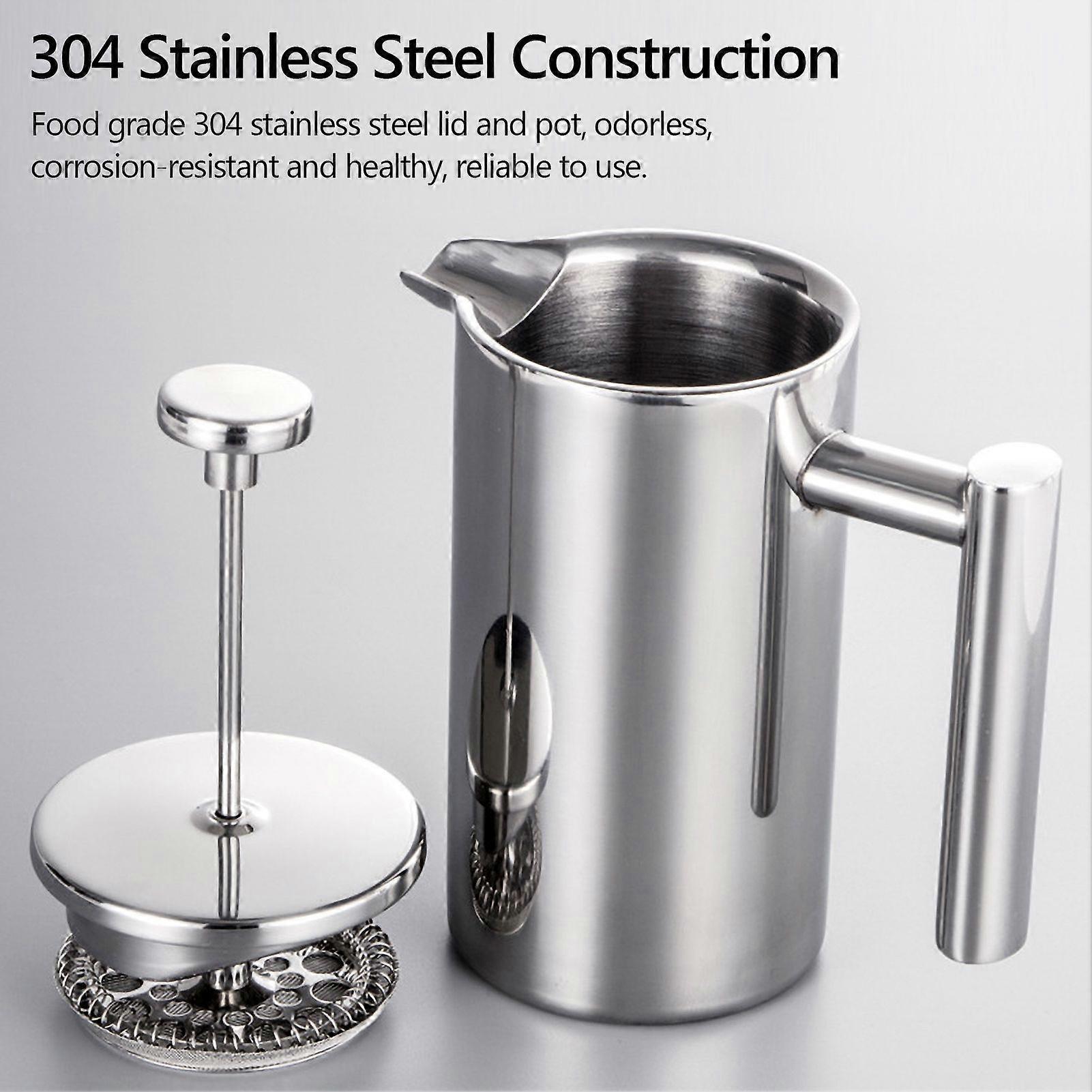 Feature:1. Made from 304 stainless steel, anti-rust, odorless and healthy.2. Double wall insulation helps keep the coffee hot for 1 hour.3. Fine mesh filter produces exceptional flavors.4. Ergonomic handle stays cool and will not scald your hands.5. U-shaped spout provides an easy pour to reduce spills and drips.6. Perfect choice for home and office.Specification:This stainless steel french press coffee maker is built with double wall construction to maintain the coffee heat, and the fine mesh filter to maker delicious coffee. With ergonomic handle and U-shaped spout, this coffee maker is easy to use, great choice for home and office.Features:Made from 304 stainless steel, anti-rust, odorless and healthy.Double wall insulation helps keep the coffee hot for 1 hour.Fine mesh filter produces exceptional flavors.Ergonomic handle stays cool and will not scald your hands.U-shaped spout provides an easy pour to reduce spills and drips.Perfect choice for home and office.Specifications:Material: Stainless steelCapacity: 350ml / 800ml / 1000ml (optional)Dimension:350ml: 76 * 163mm / 3 * 6.4in (D * H); weight: approx. 450g / 1lb800ml: 90 * 170mm / 3.5 * 6.7in (D * H); weight: approx. 620g / 1.4lb1000ml: 105 * 220mm / 4.1 * 8.7in (D * H); weight: approx. 800g / 1.8lbPackage List:1 * French Press Coffee PotPackage List:1 * French Press Coffee Pot