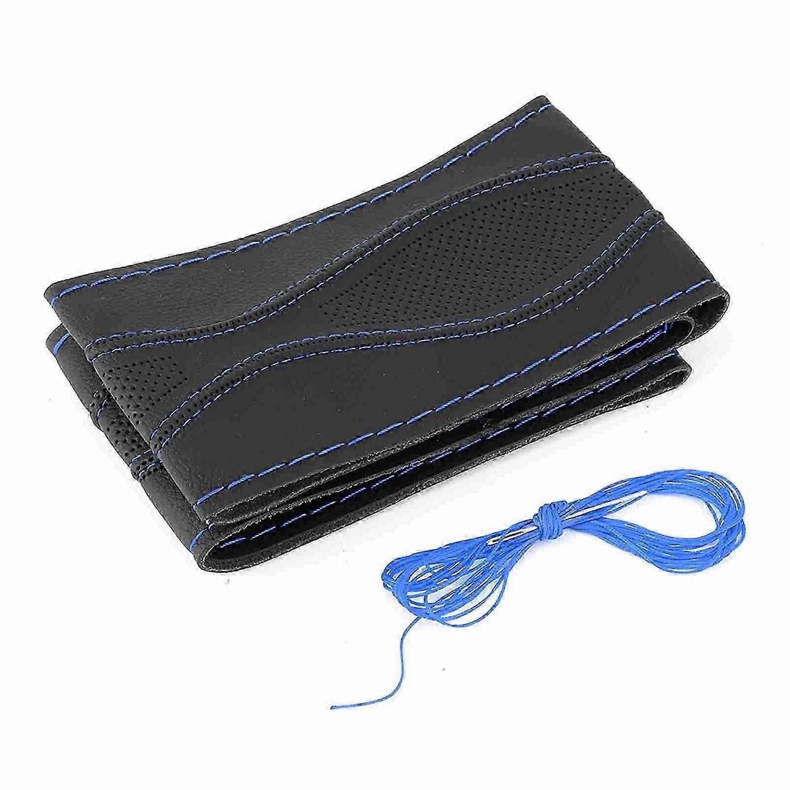 38cm/15in Leather Steering Wheel Wrap Cover Hand Stitching Embossing with Needle and Thread UniversalBlack Blue