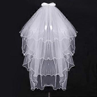 4 Tier Layered Womens Wedding Veil Imitation Pearl Handmade Beaded Ribbon Bowkno
