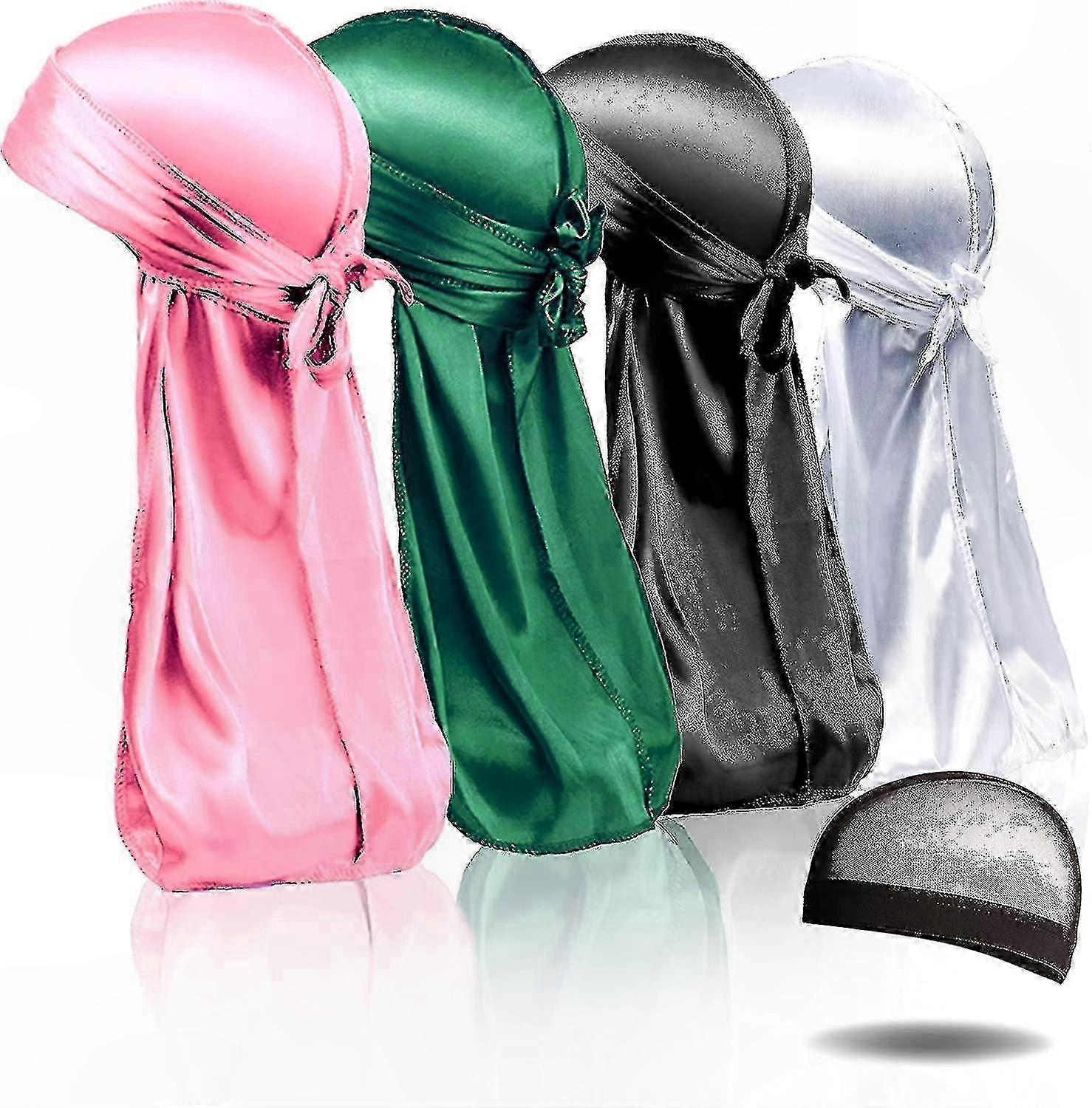 4-Pack Silky Satin Durags for Men & Women, Includes Wave Cap, Extra Long Tails for Styling Waves