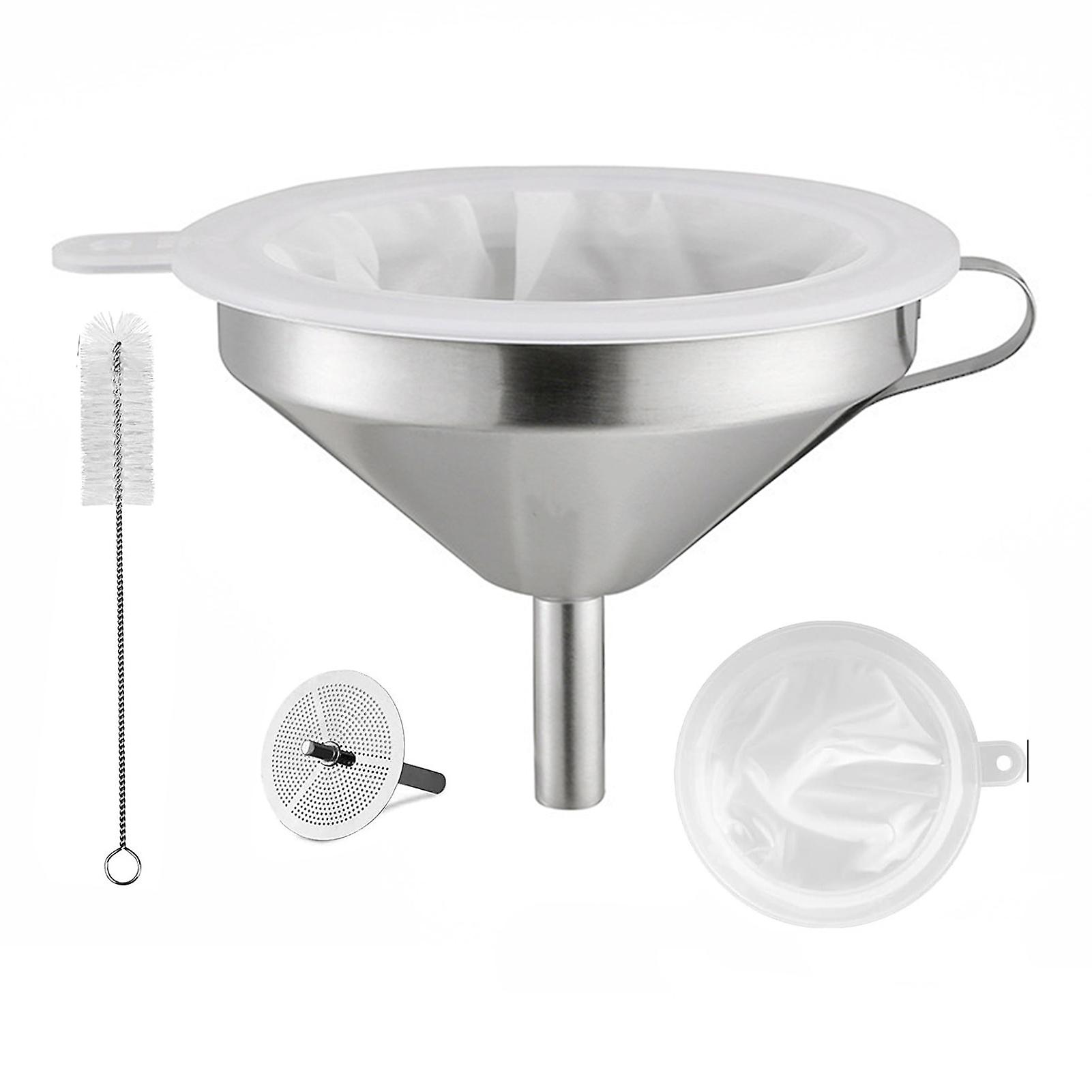 4Pcs Stainless Steel Funnel with Handle 200 Fine Mesh Filter Cleaning Brush Liquid Oil Jam Transferring Funnel Strainer Kitchen Supplies