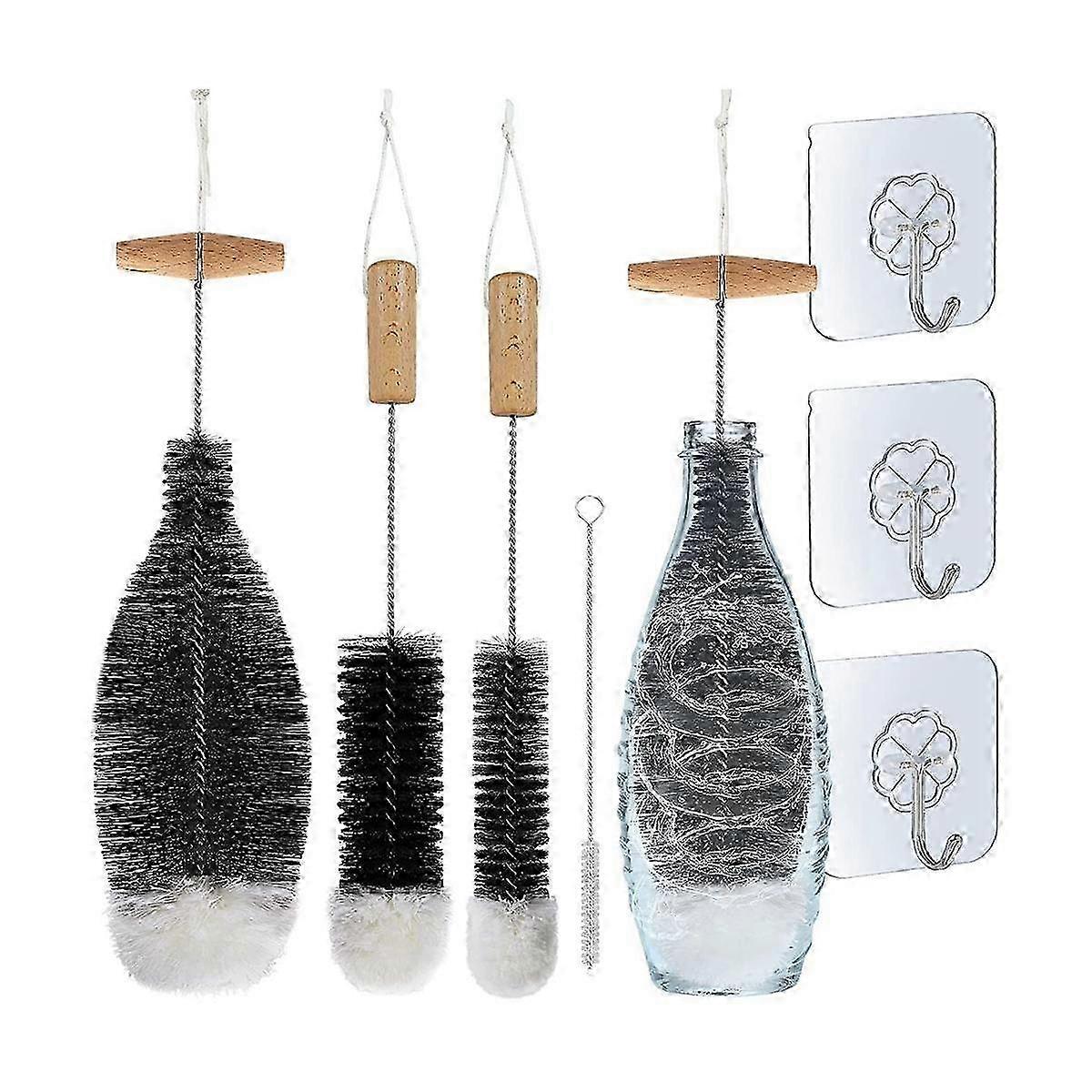 Bottle Brush Cleaning Brush, Pack of 4 Bottle Brushes and 3 Organising Hooks Bottle Cleaner for Was