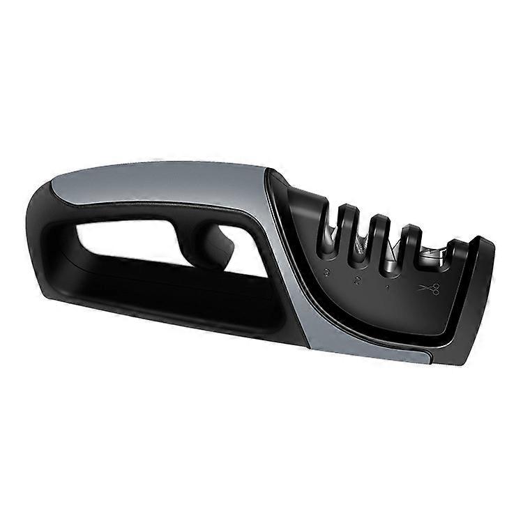 Color: As shown. WHY CHOOSE THIS sharpener? 1. Fits all sizes of knives and scissors. 2. Four slots: 4 slots meet different sharpening needs. 3. Safety and comfort: Non-slip rubber base and ergonomic handle for easy operation by both right and left handed users. 4. Durable ABS plastic construction. 4 in 1 SHARPENING SYSTEM: Revolutionizing knife sharpening with four functions, including scissors sharpening, convenient and space-saving. SAFE & EASY TO USE: Simply place the blade in the slot and gently pull in one direction. Coarse slot for blunt knives, fine ceramic slot sharpens and polishes. Non-slip grip bottom keeps stable. HIGH QUALITY MATERIALS: Made of ABS plastic for durability. 'ESSENCE' slot: tungsten steel; 'CRUDE' slot: diamond sharpening stone; 'FINE' slot: ceramic; scissor slot: ceramic. SUITABLE FOR MOST KNIVES: Salvage old knives, suitable for most kitchen utensils, large and long knives. Not suitable for serrated knives.